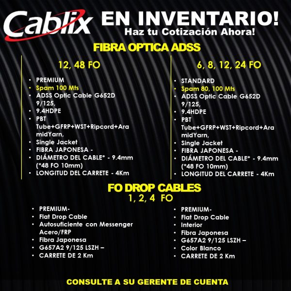 Read more Cables de fibra óptica Cablix March 8, 2023 [siteorigin_widget class=”SiteOrigin_Widget_Image_Widget”][/siteorigin_widget] Contact Us Cables de fibra óptica Los cables de fibra óptica son un tipo de cable de transmisión... Continue reading