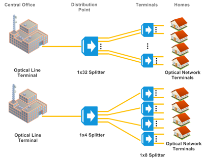 Splitter PLC están ampliamente instalado entre la Terminal PON de línea óptica (OLT) y las red de terminales/unidades ópticas (ONUs/ONTs) que sirve a la OLT. El enlace de fibra procedente de la Central Office (CO) OLT está conectado con la entrada de splitter y se dividen en el número de fibras que salen del splitter.
