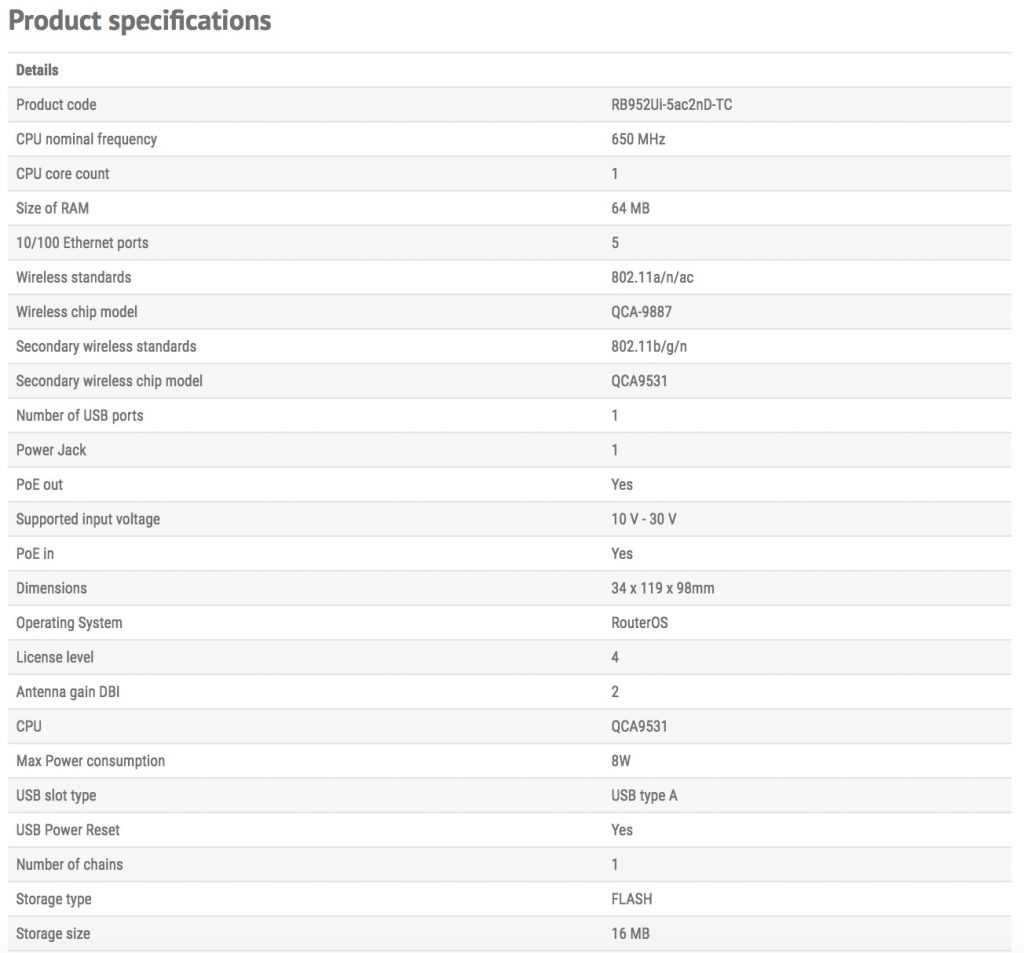 Unit is equipped with a 650MHz CPU, 64MB RAM, five 10/100Mbps Ethernet ports (PoE output on port #5), dual-chain 802.11b/g/n 2.4GHz wireless, single chain 802.11ac 5GHz wireless, USB port for 3G/4G modem and a RouterOS L4 license.