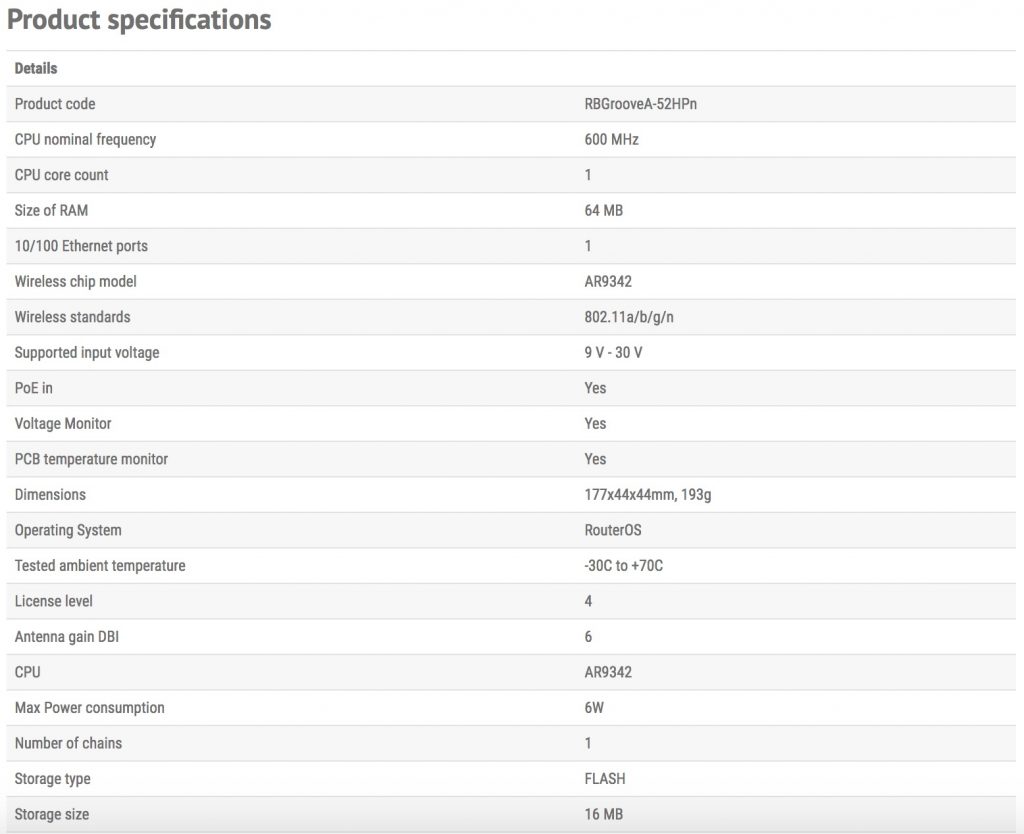 Our smallest outdoor series model – a fully featured wireless RouterBOARD powered by RouterOS. Weatherproof, durable and ready to use. It has one 10/100 Ethernet port with PoE support and a built in wireless radio. It has software selectable 2 or 5GHz wireless mode, and high 500mW output power! GrooveA has also supports AP mode.